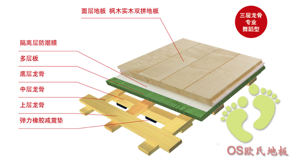 體育運動木地板—三層龍骨專業舞蹈型結構是我歐氏地板有限公司為迎合**體育地板行業的發展趨勢,及時研發的專業舞臺木地板系統,它不但堅固耐用而且彈性十足。并且具備舞臺木地板所有功能: